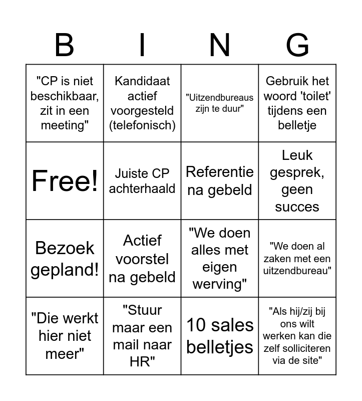 This bingo card has 16 words: "Stuur maar een mail naar HR", "We doen al zaken met een uitzendbureau", "Uitzendbureaus zijn te duur", "CP is niet beschikbaar, zit in een meeting", Bezoek gepland!, Kandidaat actief voorgesteld (telefonisch), "We doen alles met eigen werving", 10 sales belletjes, Free!, Juiste CP achterhaald, "Die werkt hier niet meer", Gebruik het woord 'toilet' tijdens een belletje, Actief voorstel na gebeld, Leuk gesprek, geen succes, Referentie na gebeld and "Als hij/zij bij ons wilt werken kan die zelf solliciteren via de site".
