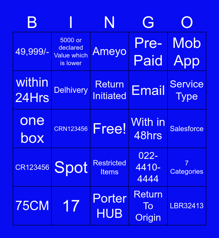This bingo card has a free space and 24 words: Spot, 17, Return Initiated, 75CM, Mob App, 49,999/-, within 24Hrs, 5000 or declared Value which is lower, With in 48hrs, Restricted Items, Email, one box, 022-4410-4444, 7 Categories, Delhivery, Return To Origin, Salesforce, Ameyo, Service Type, CRN123456, LBR32413, CR123456, Pre-Paid and Porter HUB.