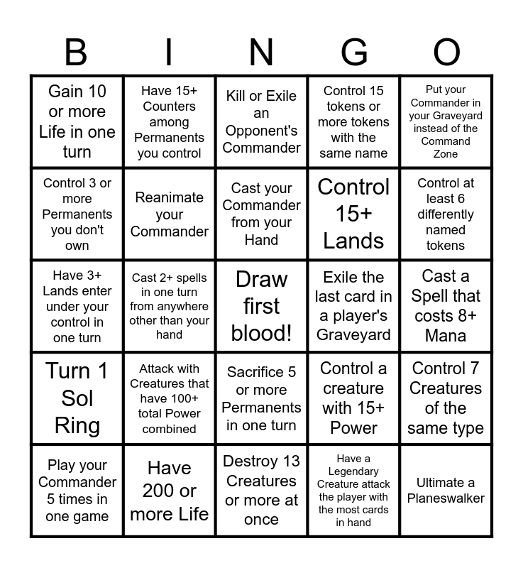 This bingo card has 35 words: Defeat a player with Commander Damage, Draw 7 or more cards in one turn, Add one colored Mana that isn't in your Color Identity, Reanimate your Commander, Sacrifice 5 or more Permanents in one turn, Control 15 tokens or more tokens with the same name, Control 3 or more Permanents you don't own, Cast 3 or more Instant or Sorcery Spells in one turn, Cast your Commander from your Hand, Deal Combat damage to each opponent in a single Combat Step, Have 3+ Lands enter under your control in one turn, Put your Commander in your Graveyard instead of the Command Zone, Have a Dragon attack the player with the most life, Start your turn while having the "Monarch" or the "Initiative", Gain 10 or more Life in one turn, Exile the last card in a player's Graveyard, Have a Legendary Creature attack the player with the most cards in hand, Cast 2+ spells in one turn from anywhere other than your hand, Turn 1 Sol Ring, Draw first blood!, Control a creature with 15+ Power, Play your Commander 5 times in one game, Control 7 Creatures of the same type, Have 200 or more Life, Kill or Exile an Opponent's Commander, Control at least 6 differently named tokens, Ultimate a Planeswalker, Destroy a Sol Ring before Turn 4, Control 15+ Lands, Cast a Spell that costs 8+ Mana, Cast your Commander with Mana from a Command Tower+ Signet, Destroy 13 Creatures or more at once, Attack with Creatures that have 100+ total Power combined, Have 15+ Counters among Permanents you control and Counter a Mythic Spell.