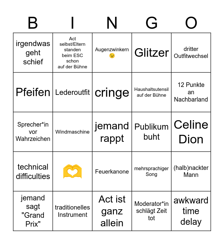 This bingo card has 30 words: traditionelles Instrument, Land das nicht in Europa ist, Windmaschine, 12 Punkte für einen Nachbarn, irgendwas geht schief, Augenzwinkern 😉, Lederoutfit, Feuerkanone, Publikum buht, Act ist ganz allein, Celine Dion, jemand rappt, Moderator*in schlägt Zeit tot, awkward time delay, 12 Punkte an Nachbarland, Moderator*in singt, mehrsprachiger Song, technical difficulties, 🫶, dritter Outfitwechsel, Sprecher*in vor Wahrzeichen, merkwürdige Kopfbedeckung, Act selbst/Eltern standen beim ESC schon auf der Bühne, Haushaltsutensil auf der Bühne, Pfeifen, Glitzer, (halb)nackter Mann, jemand sagt "Grand Prix", cringe and Regen🌧️.