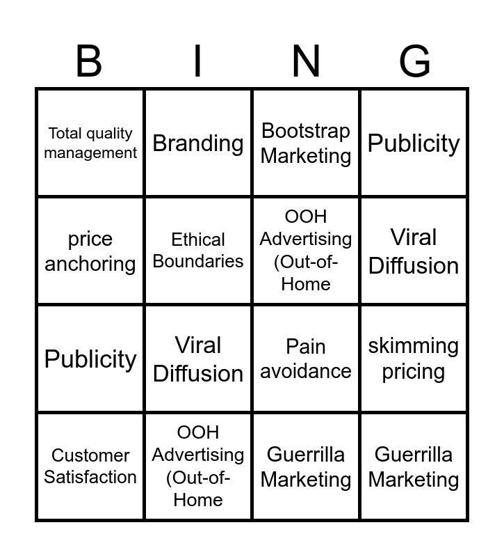 This bingo card has 20 words: skimming pricing, Reputational Risk, Bootstrap Marketing, Data mining, Customer Satisfaction, price anchoring, OOH Advertising (Out-of-Home, Total quality management, Publicity, Branding, Viral Diffusion, Pain avoidance, Ethical Boundaries, Guerrilla Marketing, OOH Advertising (Out-of-Home, FOB (free on board) pricing, Viral Diffusion, Publicity, Guerrilla Marketing and Branding.