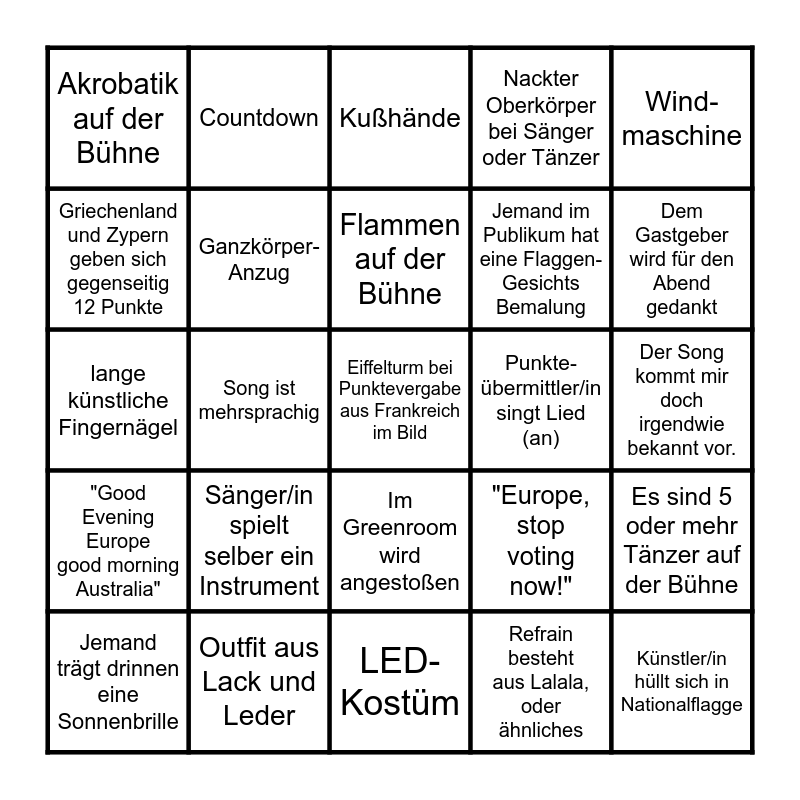 This bingo card has a free space and 48 words: Moderator/in hat sich umgezogen, Künstler/in hüllt sich in Nationalflagge, Traditionelles Kostüm / Tracht, LED-Kostüm, Sänger/in spielt selber ein Instrument, Kleidungsstück ändert sich während des Auftritts, Countdown, Handherzen für die Zuschauer, Griechenland und Zypern geben sich gegenseitig 12 Punkte, Nebel auf der Bühne, Ganzkörper- Anzug, Nackter Oberkörper bei Sänger oder Tänzer, Es sind 5 oder mehr Tänzer auf der Bühne, "Europe, stop voting now!", Telefongeste in die Kamera, Punkte-vergabe wird erklärt, Flammen auf der Bühne, Punkte-übermittler/in singt Lied (an), "Love" oder "Peace" in den Lyrics, Wind-maschine, Song ist mehrsprachig, Refrain besteht aus Lalala, oder ähnliches, Akrobatik auf der Bühne, Jemand im Publikum hat eine Flaggen- Gesichts Bemalung, Act ist kurios und antimelodisch, Dem Gastgeber wird für den Abend gedankt, Jemand trägt drinnen eine Sonnenbrille, Deutschland kriegt von einem Land mehr als 1P., Im Greenroom wird angestoßen, "Good Evening Europe good morning Australia", Sänger/in ist Barfuß, Jemand sagt „Grand Prix“, Thorsten Schorn macht einen zynischen Kommentar, 12 Punkte für Deutschland, Outfit aus Lack und Leder, Duett, Konfetti-Regen, Der Song kommt mir doch irgendwie bekannt vor., Goldregen, Overknees, "You're good to go", Die Halle singt laut hörbar mit, Kußhände, Postcard , d.h. Länder-vorstellung, mit Tieren, lange künstliche Fingernägel, Sänger/in steht auf Podest oder ähnlichem, Sänger/in löst LED-Effekte auf Bühne aus and wie aus einem Horrorfilm.
