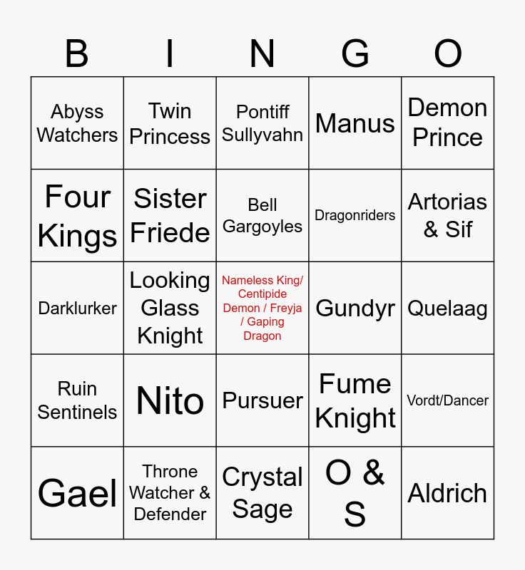 This bingo card has a free space and 24 words: Nito, Throne Watcher & Defender, Bell Gargoyles, Gael, Demon Prince, Abyss Watchers, Four Kings, Twin Princess, Gundyr, Pursuer, Dragonriders, Darklurker, Fume Knight, Vordt/Dancer, Sister Friede, O & S, Quelaag, Pontiff Sullyvahn, Artorias & Sif, Looking Glass Knight, Aldrich, Ruin Sentinels, Manus and Crystal Sage.