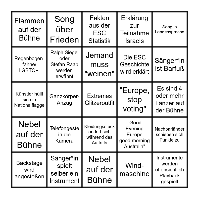 This bingo card has 40 words: Moderator/in hat sich umgezogen, Künstler hüllt sich in Nationalflagge, Traditionelles Kostüm / Tracht, Ralph Siegel oder Stefan Raab werden erwähnt, Sänger*in spielt selber ein Instrument, Kleidungsstück ändert sich während des Auftritts, Jemand muss "weinen", Handherzen für die Zuschauer, Song in Landessprache, Nebel auf der Bühne, Ganzkörper- Anzug, Erklärung zur Teilnahme Israels, Extremes Glitzeroutfit, Es sind 4 oder mehr Tänzer auf der Bühne, "Europe, stop voting", Telefongeste in die Kamera, Punkte-vergabe wird erklärt, Flammen auf der Bühne, Jemand sagt "Grand Prix", Fakten aus der ESC Statistik, Nachbarländer schieben sich Punkte zu, Wind-maschine, Die ESC Geschichte wird erklärt, Regenbogen-fahne/ LGBTQ+-, Akrobatik auf der Bühne, Jemand im Publikum hat eine Flaggen- Gesichts Bemalung, Song in Landessprache, Dem Gastgeber wird für den Abend gedankt, Instrumente werden offensichtlich Playback gespielt, Jemand trägt drinnen eine Sonnenbrille, Deutschland kriegt von einem Land mehr als 5P., Backstage wird angestoßen, Warum der ESC in Basel ist wird erklärt, "Good Evening Europe good morning Australia", Sänger*in ist Barfuß, Nebel auf der Bühne, Feuer auf der Bühne, Das Land liegt nicht in Europa, Song über Frieden and Ein weitere Break-Up Song.