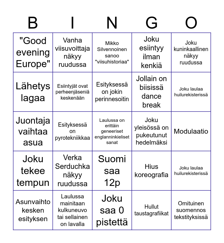 This bingo card has 25 words: Verka Serduchka näkyy ruudussa, Joku saa 0 pistettä, Esityksessä on jokin perinnesoitin, Asunvaihto kesken esityksen, Joku kuninkaallinen näkyy ruudussa, "Good evening Europe", Lähetys lagaa, Vanha viisuvoittaja näkyy ruudussa, Joku yleisössä on pukeutunut hedelmäksi, Suomi saa 12p, Jollain on biisissä dance break, Juontaja vaihtaa asua, Hius koreografia, Joku laulaa huilurekisterissä, Esiintyjät ovat perheenjäseniä keskenään, Omituinen suomennos tekstityksissä, Modulaatio, Mikko Silvennoinen sanoo "viisuhistoriaa", Joku laulaa huilurekisterissä, Esityksessä on pyrotekniikkaa, Laulussa on erittäin geneeriset englanninkieliset sanat, Laulussa mainitaan kulkuneuvo tai sellainen on lavalla, Joku tekee tempun, Joku esiintyy ilman kenkiä and Hullut taustagrafiikat.