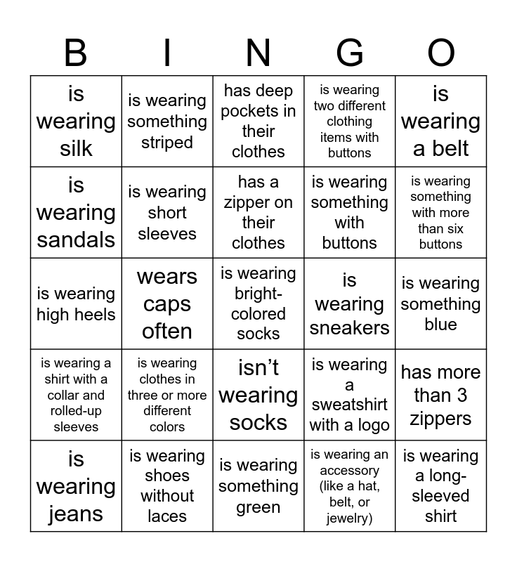 This bingo card has 25 words: is wearing clothes in three or more different colors, is wearing something green, has a zipper on their clothes, is wearing jeans, is wearing a belt, is wearing silk, is wearing sandals, is wearing something striped, is wearing sneakers, isn’t wearing socks, is wearing something with buttons, is wearing high heels, is wearing a sweatshirt with a logo, has more than 3 zippers, is wearing short sleeves, is wearing a long-sleeved shirt, is wearing something blue, has deep pockets in their clothes, is wearing something with more than six buttons, wears caps often, is wearing bright-colored socks, is wearing shoes without laces, is wearing a shirt with a collar and rolled-up sleeves, is wearing two different clothing items with buttons and is wearing an accessory (like a hat, belt, or jewelry).