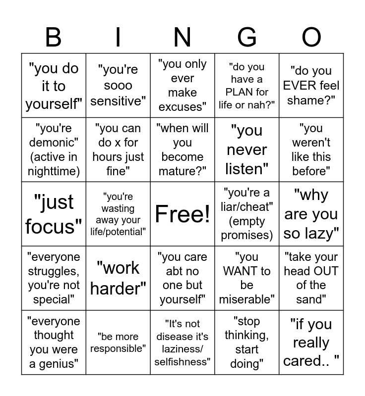 This bingo card has a free space and 24 words: "work harder", "be more responsible", "when will you become mature?", "everyone thought you were a genius", "do you EVER feel shame?", "you do it to yourself", "you're demonic" (active in nighttime), "you're sooo sensitive", "you're a liar/cheat" (empty promises), "you care abt no one but yourself", "you never listen", "just focus", "you WANT to be miserable", "take your head OUT of the sand", "you can do x for hours just fine", "stop thinking, start doing", "why are you so lazy", "you only ever make excuses", "you weren't like this before", "you're wasting away your life/potential", "if you really cared.. ", "everyone struggles, you're not special", "do you have a PLAN for life or nah?" and "It's not disease it's laziness/ selfishness".