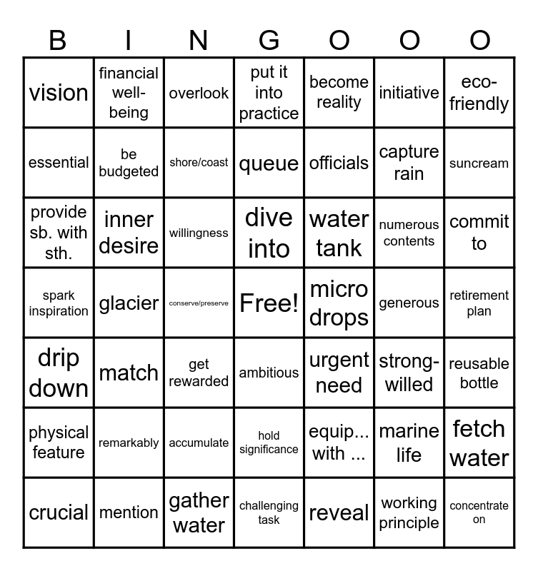 This bingo card has a free space and 63 words: engaging games, retirement plan, bank account, numerous contents, get rewarded, crucial, financial well-being, natural resources, essential, mention, dive into, equip... with ..., provide sb. with sth., become reality, safe elements, initiative, officials, vision, timing, be budgeted, willingness, inner desire, put it into practice, match, extra budget, strong-willed, ambitious, elegant, generous, physical feature, quote, hold significance, be passionate about, pollution-free, shore/coast, commit to, marine life, conserve/preserve, reusable bottle, eco-friendly, queue, suncream, fetch water, more efficiently, capture rain, spark inspiration, concentrate on, water tank, gather water, reveal, working principle, glacier, drip down, motivation, temporary problem, overlook, accumulate, urgent need, remarkably, challenging task, fog/mist, micro drops and innovative way.