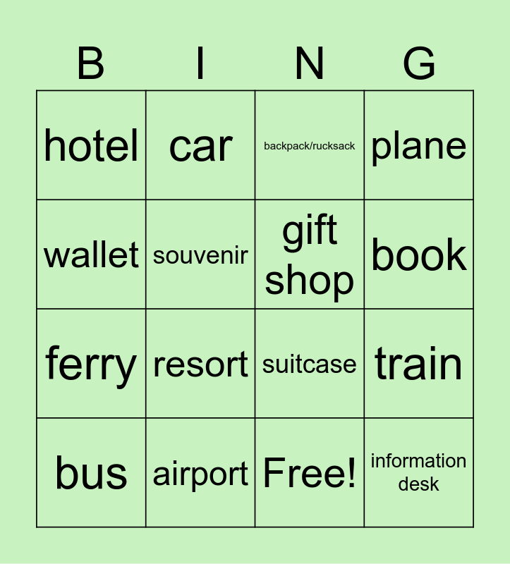 This bingo card has 17 words: Free!, bus, backpack/rucksack, hotel, resort, plane, train, gift shop, book, souvenir, airport, suitcase, wallet, car, ferry, map and information desk.