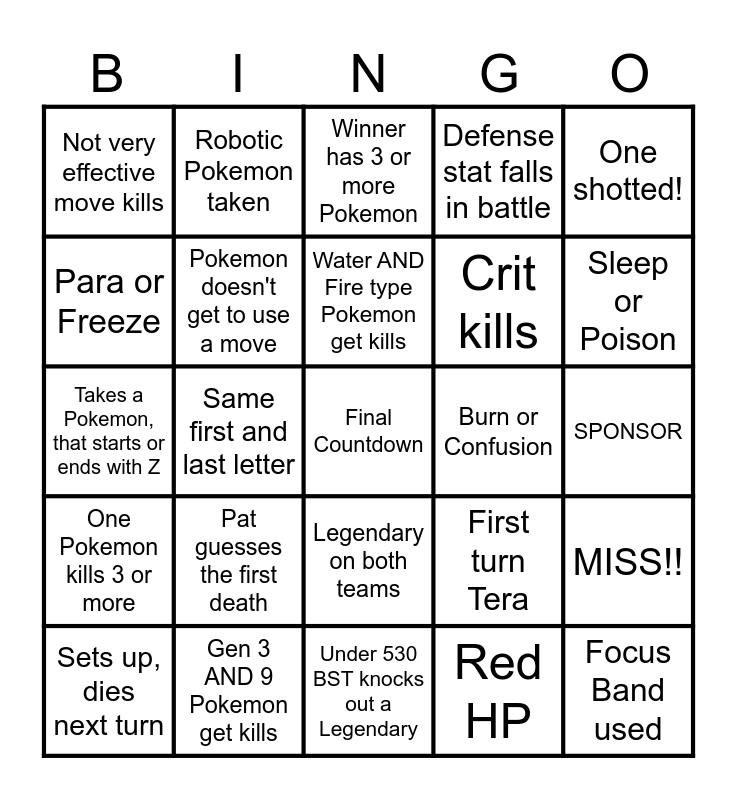 This bingo card has a free space and 24 words: Pat guesses the first death, Gen 3 AND 9 Pokemon get kills, Water AND Fire type Pokemon get kills, Sets up, dies next turn, One shotted!, Not very effective move kills, Para or Freeze, Robotic Pokemon taken, Burn or Confusion, Legendary on both teams, Crit kills, Takes a Pokemon, that starts or ends with Z, First turn Tera, MISS!!, Pokemon doesn't get to use a move, Red HP, SPONSOR, Winner has 3 or more Pokemon, Sleep or Poison, Same first and last letter, Focus Band used, One Pokemon kills 3 or more, Defense stat falls in battle and Under 530 BST knocks out a Legendary.