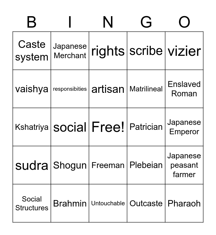 This bingo card has a free space and 29 words: Social Structures, hierarchy, social, roles, Caste system, rights, responsibities, Shogun, Patrician, Brahmin, Japanese Emperor, Pharaoh, Untouchable, Outcaste, Enslaved Roman, Enslaved Egyptian, Freeman, sudra, vizier, Kshatriya, Plebeian, Patrilineal, Matrilineal, vaishya, scribe, Japanese Merchant, Japanese peasant farmer, artisan and priest.
