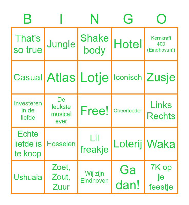 This bingo card has a free space and 32 words: Ga dan!, Anne-Fleur vakantie, De leukste musical ever, Boevenpad, Echte liefde is te koop, Atlas, Kernkraft 400 (Eindhovuh!), Waka, Jungle, Lean on, Lotje, Shake body, 1Nacht, Dirty cash, Cheerleader, Padellen, Ushuaia, Investeren in de liefde, Lil freakje, Hosselen, Loterij, Hey meisje, Links Rechts, Zoet, Zout, Zuur, 7K op je feestje, Hotel, Iconisch, Casual, That's so true, Wij zijn Eindhoven, DNA and Zusje.