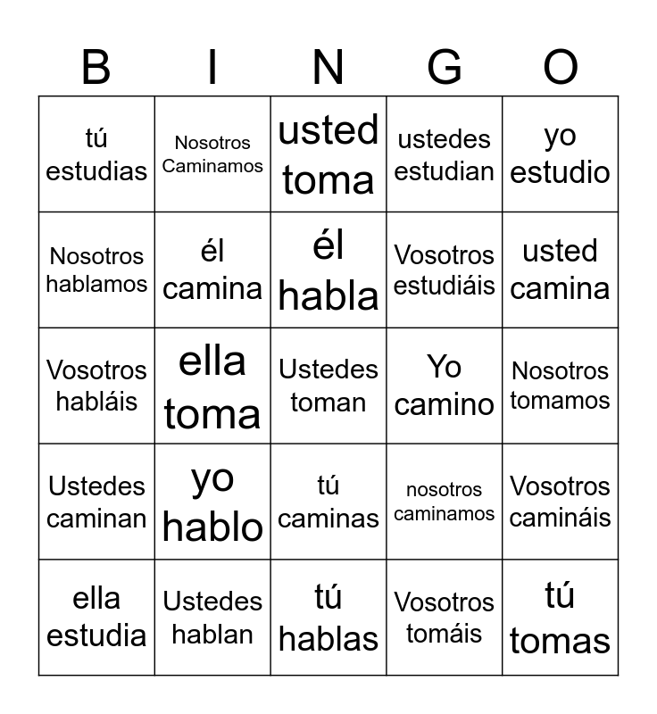 This bingo card has 25 words: yo hablo, tú hablas, él habla, ella estudia, yo estudio, tú estudias, Nosotros hablamos, Nosotros Caminamos, Yo camino, tú caminas, Vosotros estudiáis, Vosotros habláis, nosotros caminamos, Vosotros camináis, él camina, tú tomas, Nosotros tomamos, usted toma, usted camina, ella toma, Ustedes toman, Ustedes hablan, Ustedes caminan, ustedes estudian and Vosotros tomáis.
