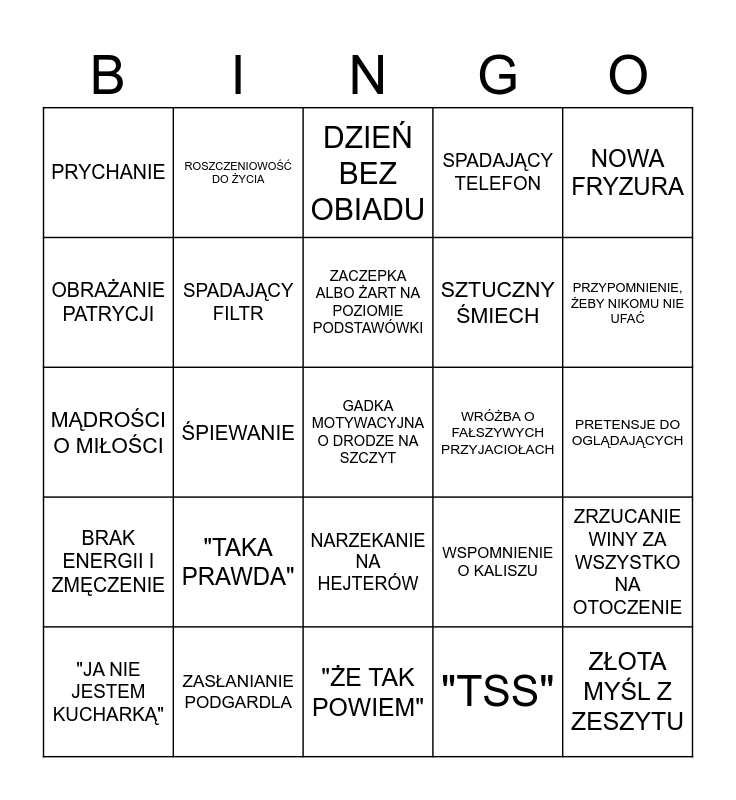 This bingo card has a free space and 24 words: "TAKA PRAWDA", ZASŁANIANIE PODGARDLA, ZACZEPKA ALBO ŻART NA POZIOMIE PODSTAWÓWKI, "JA NIE JESTEM KUCHARKĄ", NOWA FRYZURA, PRYCHANIE, OBRAŻANIE PATRYCJI, ROSZCZENIOWOŚĆ DO ŻYCIA, WRÓŻBA O FAŁSZYWYCH PRZYJACIOŁACH, NARZEKANIE NA HEJTERÓW, SZTUCZNY ŚMIECH, MĄDROŚCI O MIŁOŚCI, WSPOMNIENIE O KALISZU, ZRZUCANIE WINY ZA WSZYSTKO NA OTOCZENIE, SPADAJĄCY FILTR, "TSS", PRETENSJE DO OGLĄDAJĄCYCH, DZIEŃ BEZ OBIADU, PRZYPOMNIENIE, ŻEBY NIKOMU NIE UFAĆ, ŚPIEWANIE, ZŁOTA MYŚL Z ZESZYTU, BRAK ENERGII I ZMĘCZENIE, SPADAJĄCY TELEFON and "ŻE TAK POWIEM".