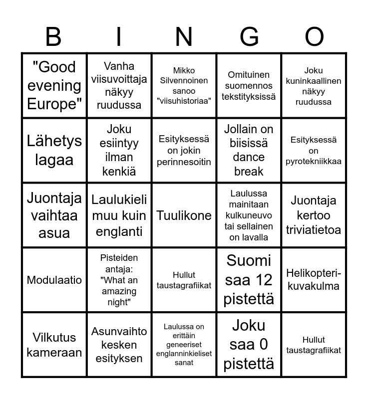 This bingo card has 26 words: Hullut taustagrafiikat, Joku saa 0 pistettä, Esityksessä on jokin perinnesoitin, Asunvaihto kesken esityksen, Joku kuninkaallinen näkyy ruudussa, "Good evening Europe", Lähetys lagaa, Vanha viisuvoittaja näkyy ruudussa, Juontaja kertoo triviatietoa, Suomi saa 12 pistettä, Jollain on biisissä dance break, Juontaja vaihtaa asua, Helikopteri-kuvakulma, Vilkutus kameraan, Laulukieli muu kuin englanti, Esiintyjät ovat perheenjäseniä keskenään, Omituinen suomennos tekstityksissä, Modulaatio, Mikko Silvennoinen sanoo "viisuhistoriaa", Tuulikone, Esityksessä on pyrotekniikkaa, Laulussa on erittäin geneeriset englanninkieliset sanat, Laulussa mainitaan kulkuneuvo tai sellainen on lavalla, Pisteiden antaja: "What an amazing night", Joku esiintyy ilman kenkiä and Hullut taustagrafiikat.