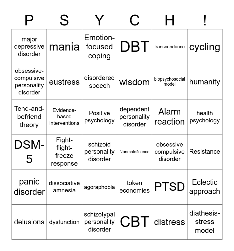 This bingo card has 42 words: distress, eustress, General adaptation syndrome, Alarm reaction, Resistance, Fight-flight-freeze response, Tend-and-befriend theory, Problem-focused coping, Emotion-focused coping, health psychology, Positive psychology, wisdom, humanity, transcendance, dysfunction, DSM-5, Eclectic approach, biopsychosocial model, diathesis-stress model, mania, cycling, agoraphobia, panic disorder, major depressive disorder, autism spectrum disorder, delusions, disordered speech, flat affect, dissociative amnesia, PTSD, histrionic personality disorder, dependent personality disorder, obsessive-compulsive personality disorder, obsessive compulsive disorder, schizotypal personality disorder, schizoid personality disorder, Nonmaleficence, Evidence-based interventions, token economies, CBT, DBT and REBT.