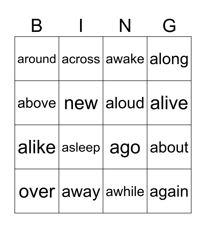 This bingo card has 16 words: away, about, awake, around, alike, across, ago, awhile, above, new, over, along, asleep, alive, aloud and again.