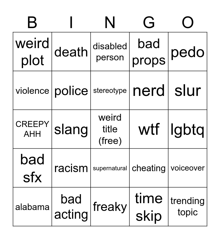 This bingo card has a free space and 24 words: racism, bad acting, stereotype, alabama, pedo, weird plot, violence, death, wtf, supernatural, nerd, CREEPY AHH, cheating, voiceover, police, time skip, lgbtq, disabled person, slur, slang, trending topic, bad sfx, bad props and freaky.