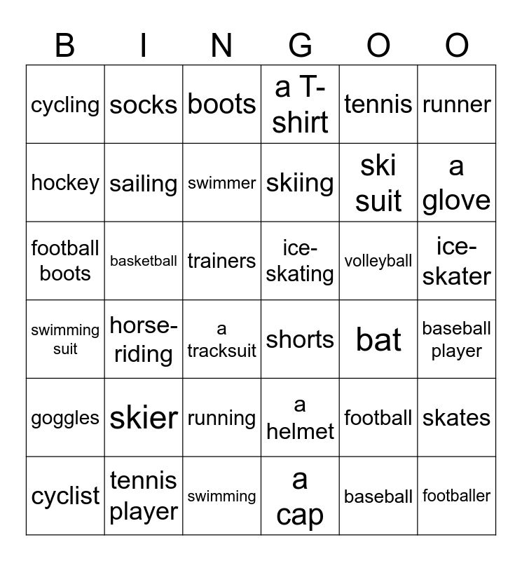This bingo card has 36 words: a helmet, running, a cap, hockey, swimming suit, ice-skating, sailing, swimming, tennis, football, a glove, a T-shirt, skates, basketball, skiing, cycling, goggles, volleyball, football boots, boots, trainers, horse-riding, shorts, a tracksuit, bat, socks, ski suit, tennis player, swimmer, runner, footballer, cyclist, baseball player, ice-skater, skier and baseball.