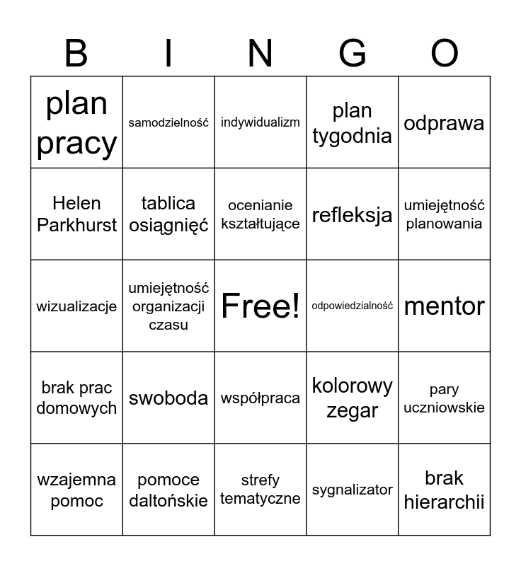This bingo card has a free space and 24 words: swoboda, pomoce daltońskie, ocenianie kształtujące, wzajemna pomoc, odprawa, plan pracy, Helen Parkhurst, samodzielność, odpowiedzialność, współpraca, refleksja, wizualizacje, kolorowy zegar, pary uczniowskie, tablica osiągnięć, sygnalizator, mentor, indywidualizm, umiejętność planowania, umiejętność organizacji czasu, brak hierarchii, brak prac domowych, plan tygodnia and strefy tematyczne.