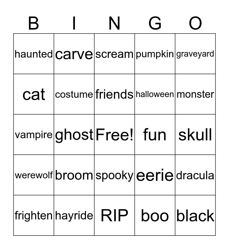 This bingo card has a free space and 53 words: bats, black, bones, boo, broom, candy, carve, coffin, cat, cauldron, costume, creepy, dracula, eerie, frankenstein, frighten, friends, fun, games, graveyard, ghost, goblin, halloween, haunted, haunted house, hayride, howl, jack-o-lantern, mask, monster, moon, mummy, night, october, party, potion, pumpkin, RIP, scream, scary, skeleton, shadows, skull, spell, spider, spooky, treat, trick, vampire, werewolf, web, witch and zombie.