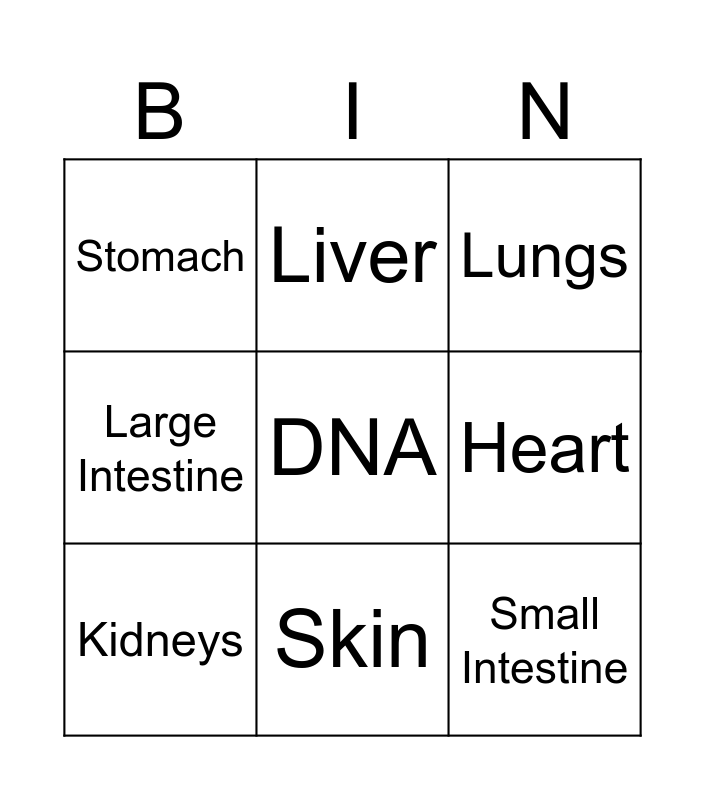 This bingo card has a free space and 8 words: Heart, Lungs, Liver, Kidneys, Stomach, Small Intestine, Large Intestine and Skin.