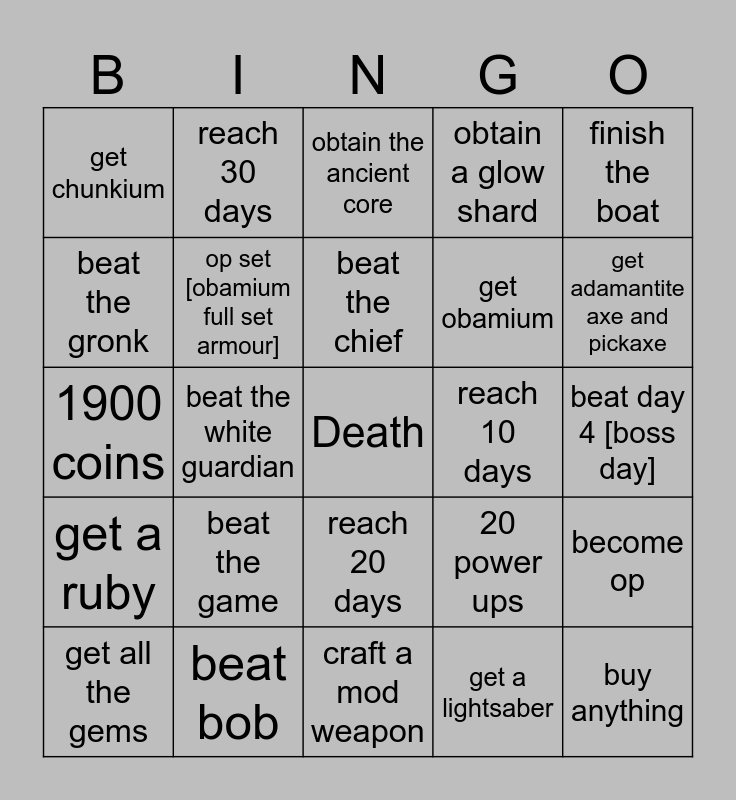 This bingo card has a free space and 24 words: beat the game, beat bob, beat the chief, get all the gems, finish the boat, get chunkium, beat the gronk, reach 30 days, reach 10 days, reach 20 days, get obamium, 1900 coins, 20 power ups, become op, op set [obamium full set armour], get a lightsaber, beat day 4 [boss day], obtain the ancient core, get adamantite axe and pickaxe, beat the white guardian, buy anything, get a ruby, obtain a glow shard and craft a mod weapon.