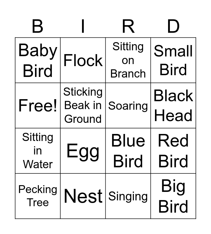 This bingo card has 16 words: Nest, Red Bird, Sitting on Branch, Baby Bird, Sitting in Water, Flock, Blue Bird, Singing, Free!, Sticking Beak in Ground, Pecking Tree, Small Bird, Egg, Black Head, Soaring and Big Bird.