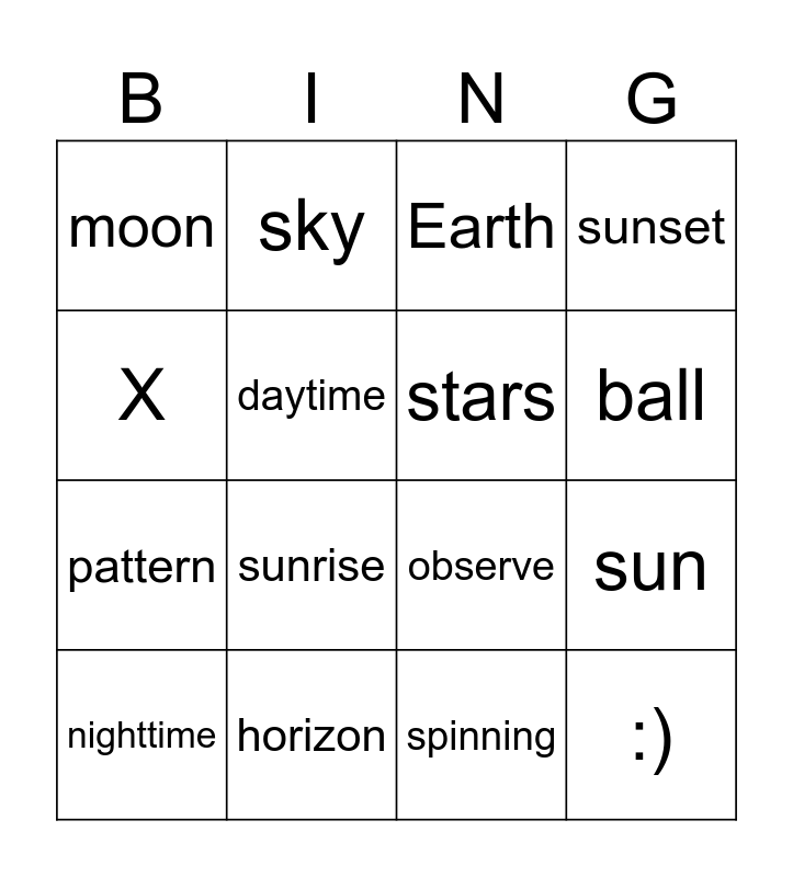 This bingo card has 16 words: horizon, sun, Earth, moon, pattern, sky, observe, spinning, X, daytime, nighttime, sunset, sunrise, ball, stars and :).