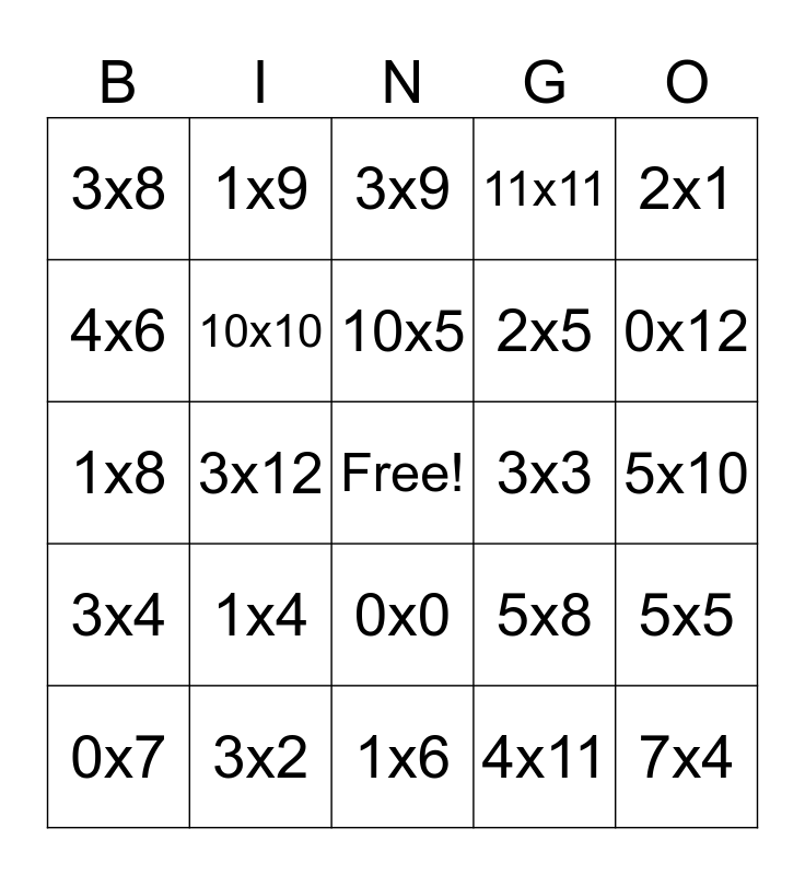 This bingo card has a free space and 24 words: 1x4, 3x2, 10x5, 0x7, 2x1, 3x8, 4x6, 1x9, 3x3, 0x0, 2x5, 1x8, 5x8, 5x5, 10x10, 4x11, 5x10, 3x9, 0x12, 3x12, 7x4, 3x4, 11x11 and 1x6.