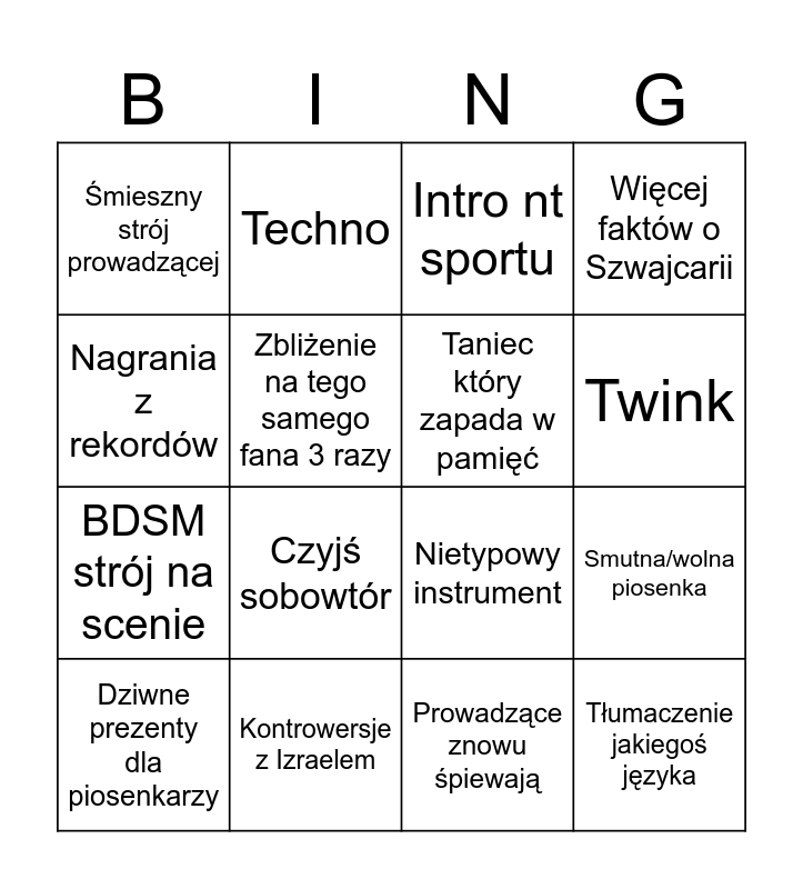 This bingo card has 16 words: Kontrowersje z Izraelem, Smutna/wolna piosenka, Intro nt sportu, Śmieszny strój prowadzącej, BDSM strój na scenie, Techno, Nietypowy instrument, Prowadzące znowu śpiewają, Nagrania z rekordów, Zbliżenie na tego samego fana 3 razy, Dziwne prezenty dla piosenkarzy, Więcej faktów o Szwajcarii, Czyjś sobowtór, Twink, Taniec który zapada w pamięć and Tłumaczenie jakiegoś języka.