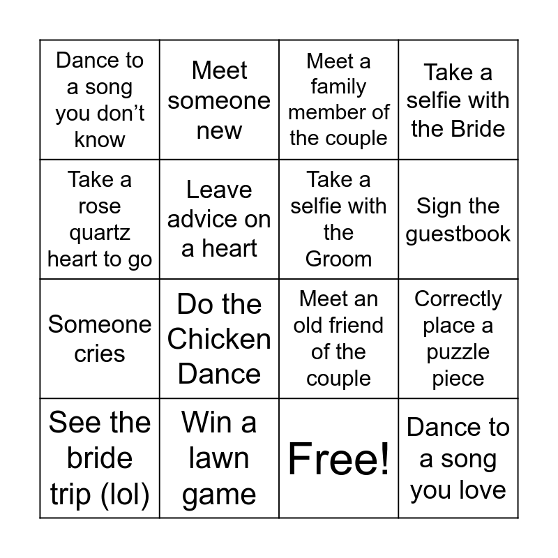 This bingo card has 17 words: Free!, See the bride trip (lol), Meet a family member of the couple, Dance to a song you don’t know, Do the Chicken Dance, Take a selfie with the Bride, Correctly place a puzzle piece, Take a selfie with the Groom, Sign the guestbook, Leave advice on a heart, Win a lawn game, Meet an old friend of the couple, Take a rose quartz heart to go, Meet someone new, Someone cries, Talk to someone from a different state and Dance to a song you love.