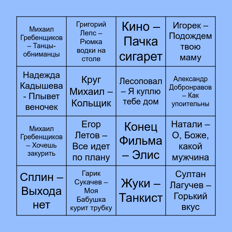 This bingo card has 30 words: Король и Шут – Ели мясо мужики, Би-2 – Большие города, Натали – О, Боже, какой мужчина, Ленинград – Рыба моей мечты, Михаил Гребенщиков – Танцы-обниманцы, Кино – Пачка сигарет, Лесоповал – Я куплю тебе дом, Агата Кристи – Я на тебе, как на войне, Гарик Сукачев – Моя Бабушка курит трубку, Пьер Нарцисс – шоколадный заяц, Жуки – Танкист, Сплин – Выхода нет, ДДТ – Что такое осень, Круг Михаил – Девочка пай, Егор Летов – Все идет по плану, Леприконсы - Хали-Гали, Баста – Моя игра, Султан Лагучев – Горький вкус, Татьяна Куртукова - Матушка земля, Надежда Кадышева - Плывет веночек, Конец Фильма – Элис, Любэ – Комбат, Григорий Лепс – Рюмка водки на столе, Михаил Гребенщиков – Хочешь закурить, Круг Михаил – Кольщик, Игорек – Подождем твою маму, Смысловые Галлюцинации – Вечно молодой, Ногу Свело! – Идем на восток, Александр Добронравов – Как упоительны and Би-2 – Серебро.