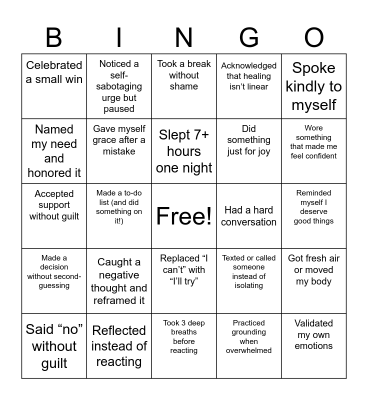 This bingo card has a free space and 24 words: Caught a negative thought and reframed it, Reflected instead of reacting, Slept 7+ hours one night, Said “no” without guilt, Spoke kindly to myself, Celebrated a small win, Named my need and honored it, Noticed a self-sabotaging urge but paused, Had a hard conversation, Replaced “I can’t” with “I’ll try”, Did something just for joy, Accepted support without guilt, Texted or called someone instead of isolating, Got fresh air or moved my body, Gave myself grace after a mistake, Practiced grounding when overwhelmed, Reminded myself I deserve good things, Took a break without shame, Wore something that made me feel confident, Made a to-do list (and did something on it!), Validated my own emotions, Made a decision without second-guessing, Acknowledged that healing isn’t linear and Took 3 deep breaths before reacting.