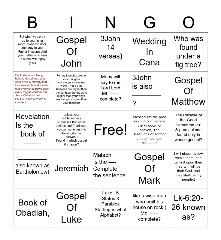 This bingo card has a free space and 24 words: Book of Obadiah,, Jeremiah, Many will say to me Lord Lord Mt: ——complete?, like a wise man who built his house on rock.) Mt: ——complete?, Who was found under a fig tree?, But when you pray, go to your inner room, close the door, and pray to your Father in secret. And your Father who sees in secret will repay you.), Gospel Of John, 3John 14 verses), Blessed are the poor in spirit, for theirs is the kingdom of heaven) The Beatitudes or sermon on the mountain MT——-?, The Parable of the Good Samaritan -10 & prodigal son found only in whose gospel?, Revelation Is the —— book of ——-, For my thoughts are not your thoughts, nor are your ways my ways—For as the heavens are higher than the earth,so are my ways higher than your ways, my thoughts higher than your thoughts, Gospel Of Mark, I will place my law within them, and write it upon their hearts; I will be their God, and they shall be my people.t, Paul talks about being humble describes Jesus obedience & humility that God exalted him at the end that every knee bows down every tongue confess that Jesus Christ is Lord Paul ‘s Letter to whom & chapter?, Gospel Of Luke, Luke 15 States 3 Parables Starting in what Alphabet?, Wedding In Cana, Gospel Of Matthew, —————-also known as Bartholomew), unless your righteousness surpasses that of the scribes and Pharisees, you will not enter into the kingdom of heaven.) Found in which gospel & chapter?, Malachi Is the —- Complete the sentence, 3John is also ———— ? and Lk-6:20-26 known as?.