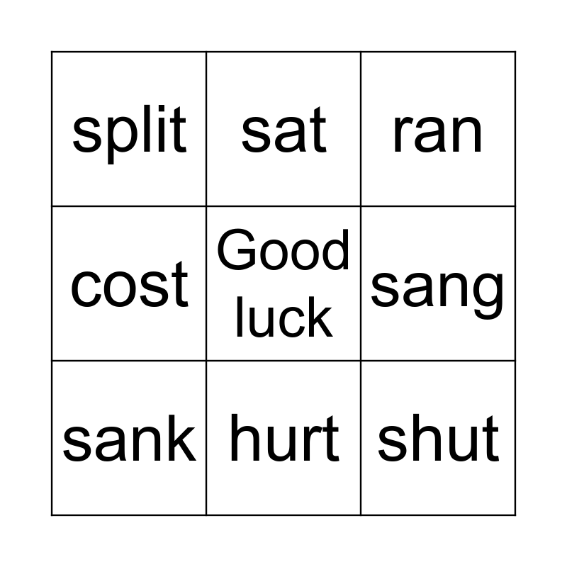 This bingo card has a free space and 11 words: spread, hurt, shut, sank, sat, ran, sang, set, cost, split and gave.
