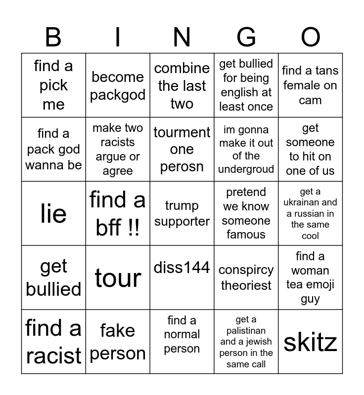 This bingo card has a free space and 24 words: tour, fake person, tourment one perosn, find a racist, find a tans female on cam, find a pick me, find a pack god wanna be, become packgod, pretend we know someone famous, diss144, im gonna make it out of the undergroud, lie, conspircy theoriest, find a woman tea emoji guy, make two racists argue or agree, get a palistinan and a jewish person in the same call, get a ukrainan and a russian in the same cool, combine the last two, get someone to hit on one of us, find a bff !!, skitz, get bullied, get bullied for being english at least once and find a normal person.