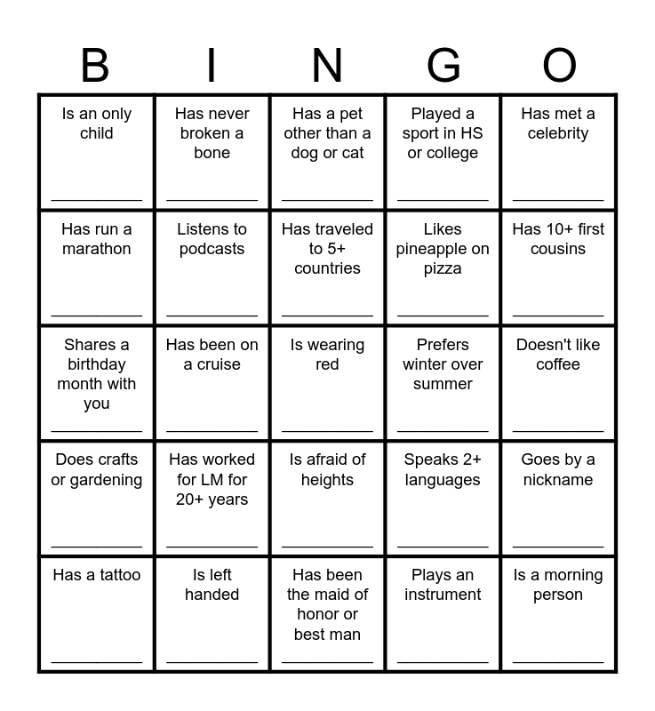 This bingo card has a free space and 24 words: Has worked for LM for 20+ years __________, Is left handed __________, Has traveled to 5+ countries __________, Has a tattoo __________, Has met a celebrity __________, Is an only child __________, Has run a marathon __________, Has never broken a bone __________, Prefers winter over summer __________, Is afraid of heights __________, Likes pineapple on pizza __________, Shares a birthday month with you __________, Speaks 2+ languages __________, Goes by a nickname __________, Listens to podcasts __________, Plays an instrument __________, Doesn't like coffee __________, Has a pet other than a dog or cat __________, Has 10+ first cousins __________, Has been on a cruise __________, Is a morning person __________, Does crafts or gardening __________, Played a sport in HS or college __________ and Has been the maid of honor or best man __________.