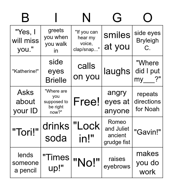 This bingo card has a free space and 24 words: drinks soda, "Times up!", calls on you, lends someone a pencil, side eyes Bryleigh C., "Yes, I will miss you.", "Katherine!", greets you when you walk in, angry eyes at anyone, "Lock in!", laughs, Asks about your ID, Romeo and Juliet ancient grudge fist, "Gavin!", side eyes Brielle, raises eyebrows, repeats directions for Noah, "If you can hear my voice, clap/snap...", "Where did I put my___?", "Where are you supposed to be right now?", makes you do work, "Tori!", smiles at you and "No!".