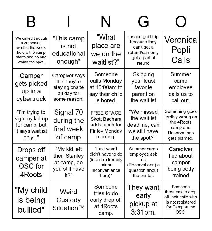 This bingo card has a free space and 34 words: "I paid for lunch/snack and my Camper didn't get it.", They want early pickup at 3:31pm., "I can't come inside to pickup because I'm not wearing shoes", "My camper was sick all week, can I get a full refund?", Drops off camper at OSC for 4Roots, Caregiver says that they're staying onsite all day for some reason., Veronica Popli Calls, "My child is being bullied", "This camp is not educational enough", "My child played soccer instead of (insert camp theme here)", Someone calls Monday at 10:00am to say their child is bored., "What place are we on the waitlist?", "Why are we doing severe weather pickup, its not even raining?", "Will my child get to see LIFE?", "We missed the waitlist deadline, can we still have the spot?", Summer camp employee calls us to call out., Weird Custody Situation™, "I'm trying to sign my kid up for camp, but it says waitlist only...", "My kid left their Stanley at camp, do you still have it?", Summer camp employee ask us (Reservations) a question about the printer., "Last year I didn't have to do (insert extremely minor inconvenience here)", Weirdly specific summer camp marketing email, We called through a 30 person waitlist the week before the camp starts and no one wants the spot., Something goes terribly wrong on the 4Roots camp and Reservations gets blamed., Someone tries to do early drop off at 4Roots camp., Someone threatens to drop off their child who is not registered for Camp at the OSC., Insane guilt trip because they can't get a refund/can only get a partial refund, Personally offended by the limit of one friend request, Skipping your least favorite parent on the waitlist, Camper gets picked up in a cybertruck, Caregiver gets mad because our camp is "too liberal", Signal 70 during the first week of camp, Caregiver lied about camper being potty trained and Gets mad at us because they can't remember their ACTIVE password..