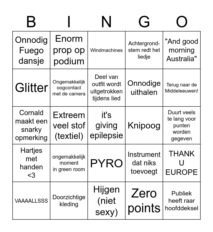 This bingo card has 35 words: Vlaggen schmink, Outfit change van hosts, Bizarre LED, Ongemakkelijk oogcontact met de camera, PYRO, Achtergrond- stem redt het liedje, Glitter, Vlag wordt op z'n kop gehouden, Deel van outfit wordt uitgetrokken tijdens lied, De hosts maken een slechte grap, Cornald maakt een snarky opmerking, "And good morning Australia", Iemand struikelt bijna, Love Love Peace Peace!!, Onnodig Fuego dansje, Knipoog, Zero points, Extreem veel stof (textiel), Hartjes met handen <3, it's giving epilepsie, Instrument dat niks toevoegt, VAAAALLSSS, THANK U EUROPE, Doorzichtige kleding, Windmachines, Terug naar de Middeleeuwen!, Publiek heeft raar hoofddeksel, Extreem lelijke edit/camera-werk, Onnodige uithalen, Duurt veels te lang voor punten worden gegeven, Overduidelijke innuendo's, Hijgen (niet sexy), ongemakkelijk moment in green room, Enorm prop op podium and Ongemakkelijk politiek moment.