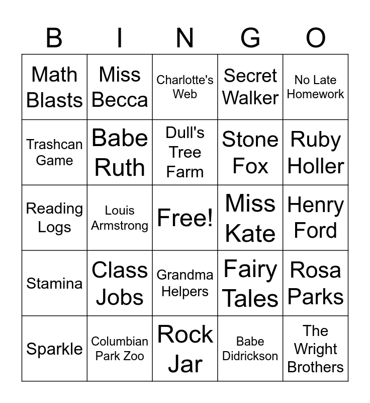This bingo card has a free space and 24 words: Class Jobs, Columbian Park Zoo, Dull's Tree Farm, Sparkle, No Late Homework, Math Blasts, Trashcan Game, Miss Becca, Miss Kate, Grandma Helpers, Stone Fox, Reading Logs, Fairy Tales, Rosa Parks, Babe Ruth, Babe Didrickson, Henry Ford, Charlotte's Web, Ruby Holler, Louis Armstrong, The Wright Brothers, Stamina, Secret Walker and Rock Jar.