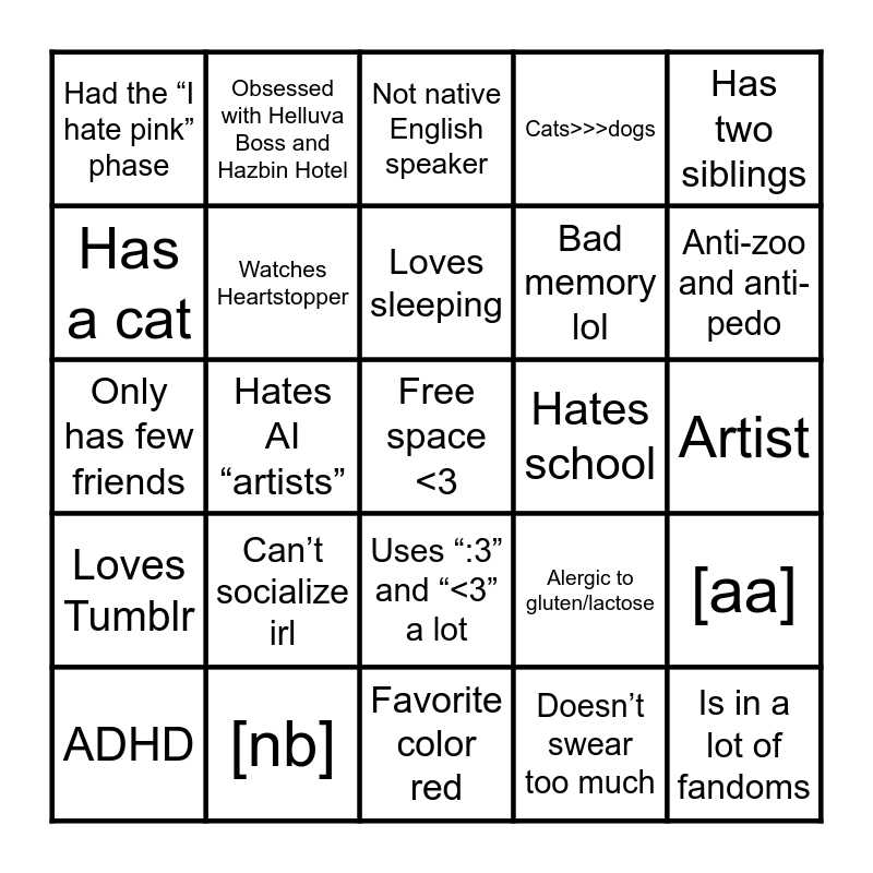 This bingo card has a free space and 24 words: ADHD, Can’t socialize irl, Loves sleeping, Doesn’t swear too much, Has two siblings, Had the “I hate pink” phase, Obsessed with Helluva Boss and Hazbin Hotel, Not native English speaker, Hates school, Artist, Only has few friends, Watches Heartstopper, Alergic to gluten/lactose, [aa], Has a cat, [nb], Favorite color red, Cats>>>dogs, Anti-zoo and anti-pedo, Loves Tumblr, Hates AI “artists”, Uses “:3” and “<3” a lot, Bad memory lol and Is in a lot of fandoms.