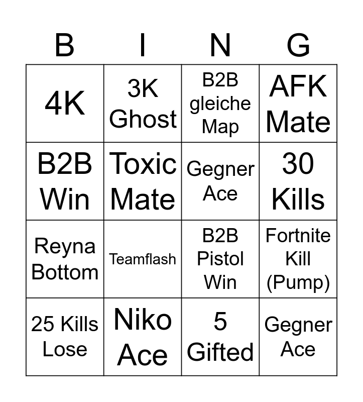 This bingo card has 16 words: Niko Ace, Fortnite Kill (Pump), B2B gleiche Map, 4K, Reyna Bottom, 3K Ghost, B2B Pistol Win, 5 Gifted, B2B Win, Toxic Mate, 25 Kills Lose, AFK Mate, Teamflash, 30 Kills, Gegner Ace and Gegner Ace.