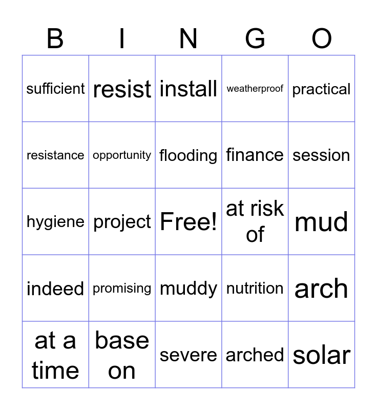 This bingo card has a free space and 42 words: flood, flooding, appropriate, promising, arched, arch, solar, panel, install, muddy, mud, session, project, practical, issue, nutrition, nutritious, hygiene, resistant, resist, resistance, productivity, productive, sufficient, income, financial, finance, risk, geographical, geography, barrier, indeed, opportunity, severe, make waves, at a time, base on, at risk of, rise above, monsoon, weatherproof and multimedia.