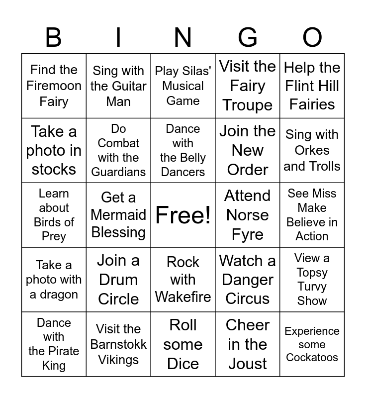 This bingo card has a free space and 24 words: Join a Drum Circle, Visit the Barnstokk Vikings, Dance with the Belly Dancers, Dance with the Pirate King, Help the Flint Hill Fairies, Find the Firemoon Fairy, Take a photo in stocks, Sing with the Guitar Man, Attend Norse Fyre, Rock with Wakefire, Join the New Order, Learn about Birds of Prey, Watch a Danger Circus, View a Topsy Turvy Show, Do Combat with the Guardians, Cheer in the Joust, See Miss Make Believe in Action, Play Silas' Musical Game, Sing with Orkes and Trolls, Get a Mermaid Blessing, Experience some Cockatoos, Take a photo with a dragon, Visit the Fairy Troupe and Roll some Dice.