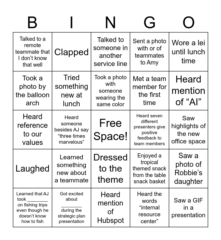 This bingo card has a free space and 29 words: Learned that AJ took ________ on fishing trips even though he doesn’t know how to fish, Attended the coffee chat, Heard someone besides AJ say “three times marvelous”, Talked to an in-office teammate that I don’t know that well, Talked to a remote teammate that I don’t know that well, Talked to someone in another service line, Tried something new at lunch, Learned something new about a teammate, Heard seven different presenters give positive feedback to team members, Got excited about ________ during the strategic plan presentation, Saw highlights of the new office space, Saw a GIF in a presentation, Heard mention of Hubspot, Heard the words “internal resource center”, Heard mention of “AI”, Snapped fingers (giving snaps), Dressed to the theme, Laughed, Wore a lei until lunch time, Heard reference to our values, Enjoyed a tropical themed snack from the table snack basket, Sat next to someone from a different service line, Met a team member for the first time, Took a photo by the balloon arch, Sent a photo with or of teammates to Amy, Clapped, Saw a photo of Robbie’s daughter, Took a photo with someone wearing the same color and Shared a recent picture of a pet/friend/family member/child with a team member.