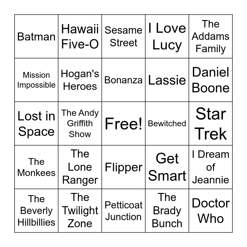 This bingo card has a free space and 24 words: The Lone Ranger, The Twilight Zone, Bonanza, The Beverly Hillbillies, The Addams Family, Batman, Mission Impossible, Hawaii Five-O, Bewitched, Flipper, Lassie, Lost in Space, Get Smart, I Dream of Jeannie, Hogan's Heroes, The Brady Bunch, Star Trek, Sesame Street, Daniel Boone, The Andy Griffith Show, Doctor Who, The Monkees, I Love Lucy and Petticoat Junction.