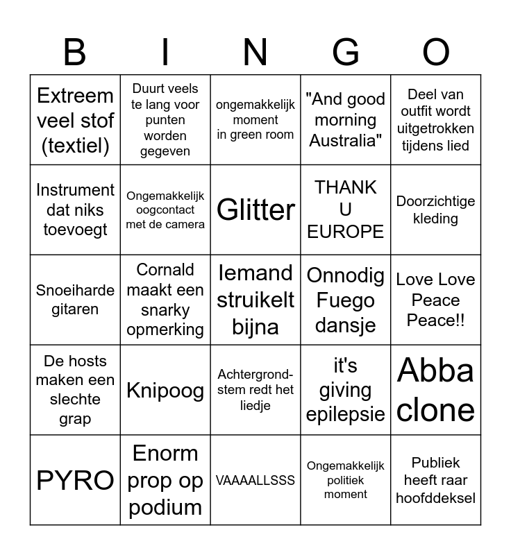 This bingo card has 39 words: Vlaggen schmink, Outfit change van hosts, Bizarre LED, Ongemakkelijk oogcontact met de camera, PYRO, Achtergrond- stem redt het liedje, Glitter, Vlag wordt op z'n kop gehouden, Deel van outfit wordt uitgetrokken tijdens lied, De hosts maken een slechte grap, Cornald maakt een snarky opmerking, "And good morning Australia", Iemand struikelt bijna, Love Love Peace Peace!!, Onnodig Fuego dansje, Knipoog, Zero points, Extreem veel stof (textiel), Hartjes met handen <3, it's giving epilepsie, Instrument dat niks toevoegt, VAAAALLSSS, THANK U EUROPE, Doorzichtige kleding, Windmachines, Terug naar de Middeleeuwen!, Publiek heeft raar hoofddeksel, Extreem lelijke edit/camera-werk, Onnodige uithalen, Duurt veels te lang voor punten worden gegeven, Overduidelijke innuendo's, Hijgen (niet sexy), ongemakkelijk moment in green room, Enorm prop op podium, Ongemakkelijk politiek moment, Volksdansen, Abba clone, Snoeiharde gitaren and Oma doet ook mee.