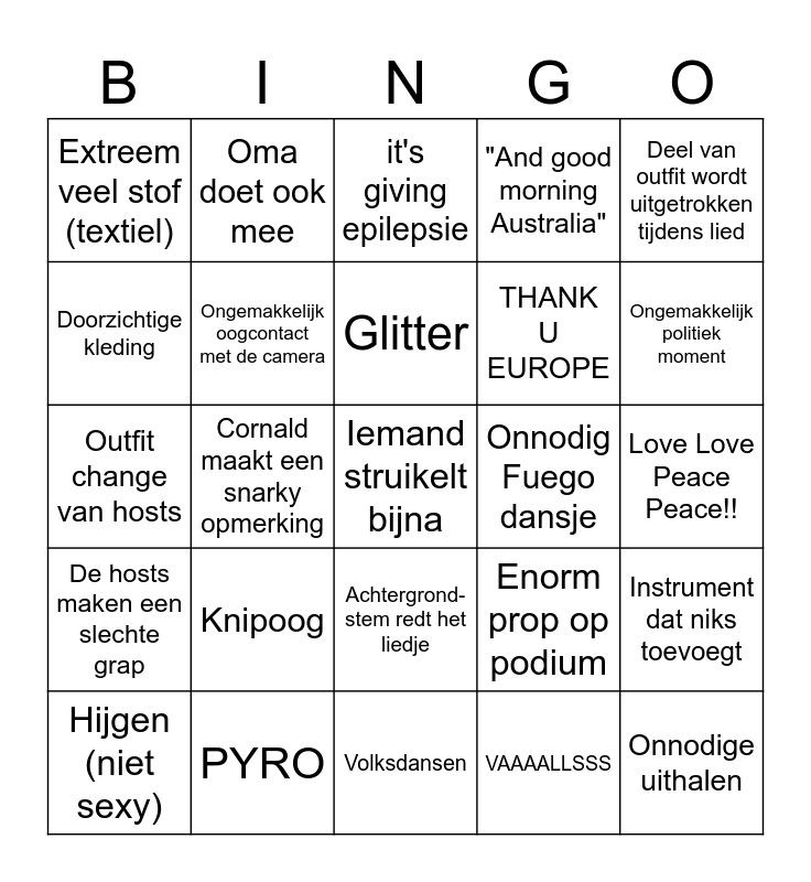 This bingo card has 40 words: Vlaggen schmink, Outfit change van hosts, Bizarre LED, Ongemakkelijk oogcontact met de camera, PYRO, Achtergrond- stem redt het liedje, Glitter, Vlag wordt op z'n kop gehouden, Deel van outfit wordt uitgetrokken tijdens lied, De hosts maken een slechte grap, Cornald maakt een snarky opmerking, "And good morning Australia", Iemand struikelt bijna, Love Love Peace Peace!!, Onnodig Fuego dansje, Knipoog, Zero points, Extreem veel stof (textiel), Hartjes met handen <3, it's giving epilepsie, Instrument dat niks toevoegt, VAAAALLSSS, THANK U EUROPE, Doorzichtige kleding, Windmachines, Terug naar de Middeleeuwen!, Publiek heeft raar hoofddeksel, Extreem lelijke edit/camera-werk, Onnodige uithalen, Duurt veels te lang voor punten worden gegeven, Overduidelijke innuendo's, Hijgen (niet sexy), ongemakkelijk moment in green room, Enorm prop op podium, Ongemakkelijk politiek moment, Volksdansen, Abba clone, Snoeiharde gitaren, Oma doet ook mee and Klederdracht.
